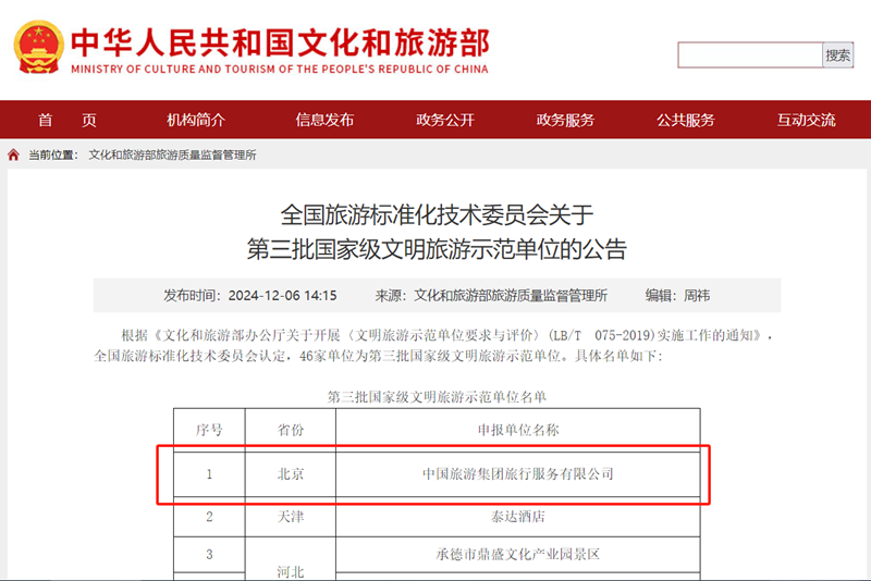 12月6日,全國(guó)旅游標(biāo)準(zhǔn)化技術(shù)委員會(huì)發(fā)布“關(guān)于第三批國(guó)家級(jí)文明旅游示范單位評(píng)定結(jié)果的公告”,中旅旅行榮獲“國(guó)家級(jí)文明旅游示范單位”稱號(hào),是此次北京市唯一獲此殊榮的單位。
