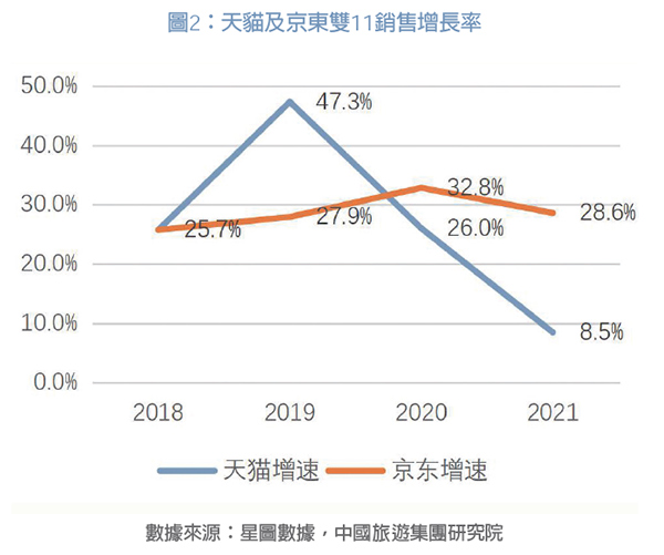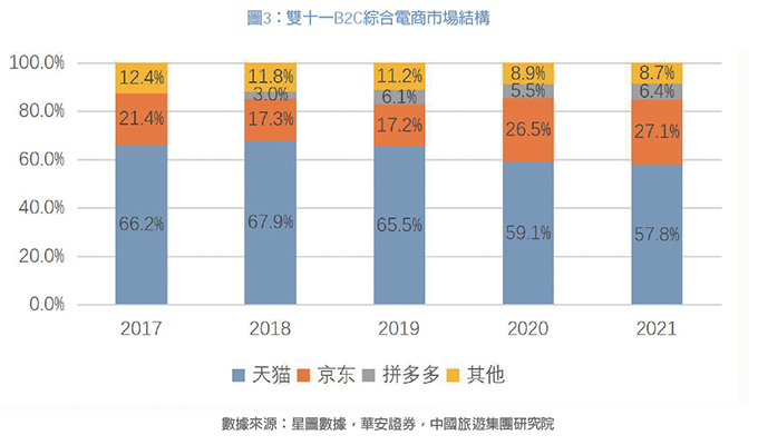 「雙11」成交額繼續(xù)上升,但整體增速放緩。2021年「雙11」全網(wǎng)成交9651億元,同比增長12.22%,相較2020年29%的增速出現(xiàn)下滑。天貓與京東仍然占據(jù)寡頭地位,占全網(wǎng)成交額的92.15%。整體來看,「雙11」在近期消費(fèi)遇冷背景下表現(xiàn)平穩(wěn),天貓?jiān)鲩L乏力不及預(yù)期,京東受益于商家二選一禁令增長亮眼。