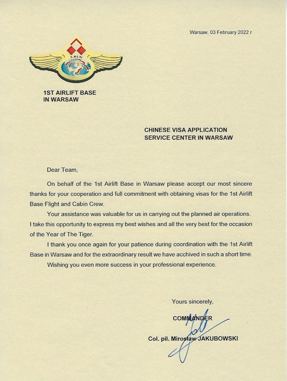 2月17日,執(zhí)飛波蘭總統(tǒng)杜達(dá)訪華專機(jī)的波蘭空軍一號基地專門派員向中旅旅行所屬華沙中國簽證申請服務(wù)中心(以下簡稱“華沙簽證中心”),送來該基地總司令Miroslaw JAKUBOWSKI將軍署名的感謝信,這是中旅旅行所屬境外簽證中心收到的第26封關(guān)于保障冬奧會的感謝信。