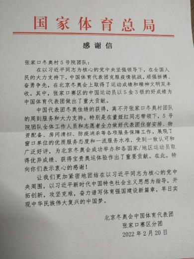 2月20日,北京冬奧會中國代表團(tuán)張家口賽區(qū)分團(tuán)專致紅頭感謝信,表達(dá)了對中旅服務(wù)團(tuán)隊(duì)的感謝。信中寫到:“中國代表團(tuán)冬奧佳績的獲得,離不開張家口冬奧服務(wù)團(tuán)隊(duì)的周到服務(wù)和大力支持?!毙胖刑貏e感謝了中旅投資咸陽海泉灣派出的骨干董婭紅帶領(lǐng)的5號院服務(wù)團(tuán)隊(duì),贊賞其為冬奧會及冬奧運(yùn)動(dòng)會提供了優(yōu)質(zhì)的服務(wù)、做出了重要貢獻(xiàn)。