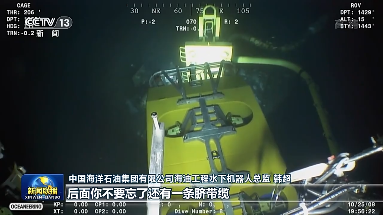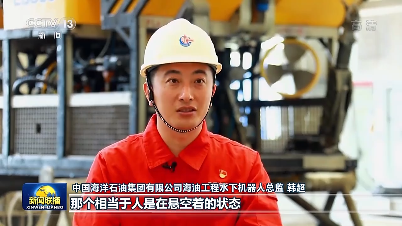 中國海洋石油集團(tuán)有限公司海油工程水下機(jī)器人總監(jiān) 韓超:你的手腳要并用,然后你要在抓的同時,后面你不要忘了還有一條臍帶纜是連著你的。你再稍微一用力,那通訊要不然斷了,要不然就絕緣報警。